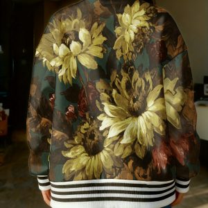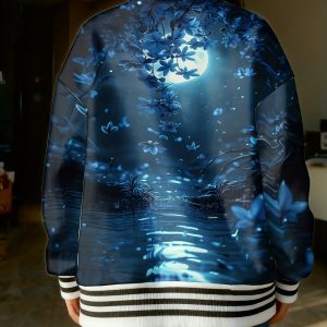 Oversized Blue Floral Moonlit Sky Baseball Jacket | Full-Body Coat with Night Sky and Flower Design, Perfect for Casual Winter Wear with Pockets, Ideal for Layering in Fall and Winter, Crew Neck, Regular Sleeve