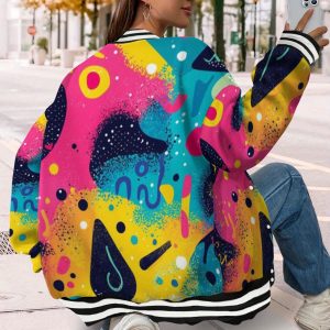Plus Size Women’s 80s 90s Retro Neon Rainbow & Universe Galaxy Print Full-Zip Hooded Jacket – Soft Blend Varsity Coat with Hood, Casual Winter Outerwear (Pinku002FYellowu002FPurpleu002FGreen), Nostalgic 8090s Style for Themed Parties & Casual Attire