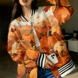 Oversized Pumpkin And Autumn Leaves Design Baseball Jacket – Complete Seasonal Pattern Coat, Stylish Casual Outerwear for Fall Winter, Cozy Long Fit with Pockets, Unisex for Everyone (No Padding