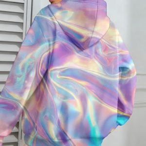 Plus Size Women’S Holographic Fabric Hooded Jacket Coat | Iridescent Full Print, Zipper Detail, Casual Style for Travel, Gatherings, and Festivals, Perfect for Gifting and Birthday Celebrations