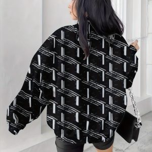Plus Size Women’S Elegant Special Line 3D Geometric Grid Pattern Jacket | Button-Front Closure, Baseball Collar, Long Sleeve, Machine Washable, Fallu002FWinter Outerwear for Casual & Transitional Weather Wear.