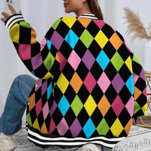 Women Baseball Jacket Colorful Rhombus Pattern Hoodie | Party Casual Geometric Print Long Sleeve T-shirt, Plus Size, V-neck, Flared Hem, Double Button Details