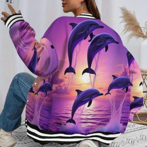 Women’S 3D Dolphin Sunset Print Baseball Jacket Hoodie | Purple & Pink Ocean Animal Graphic Long Sleeve Casual Sweatshirt, S-5XL Sizes, Fallu002FWinter Warmth, Beach Vacation Outfit, Sporty Casual Wear with Round Neck & No Padding, Easy-Care Fabric