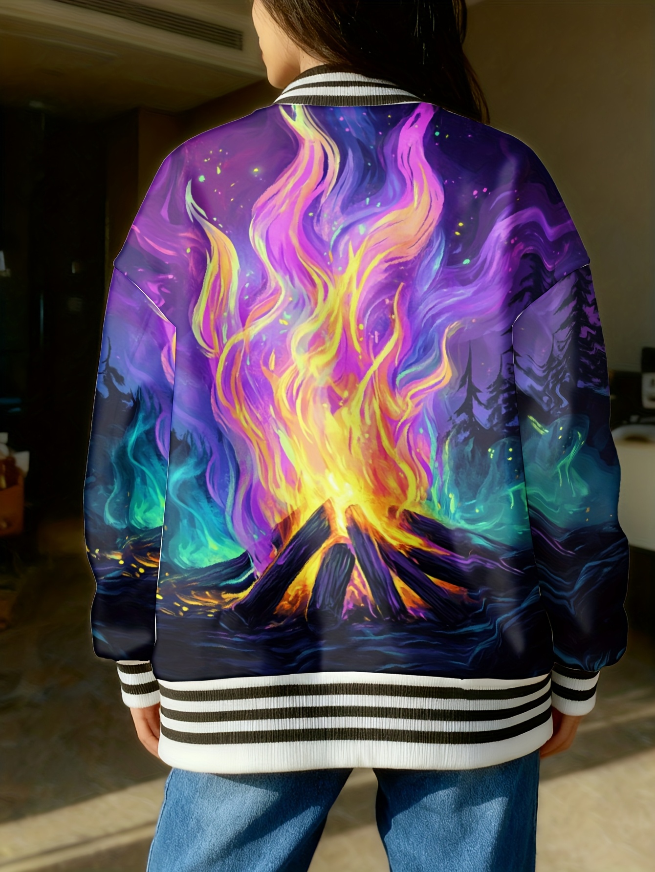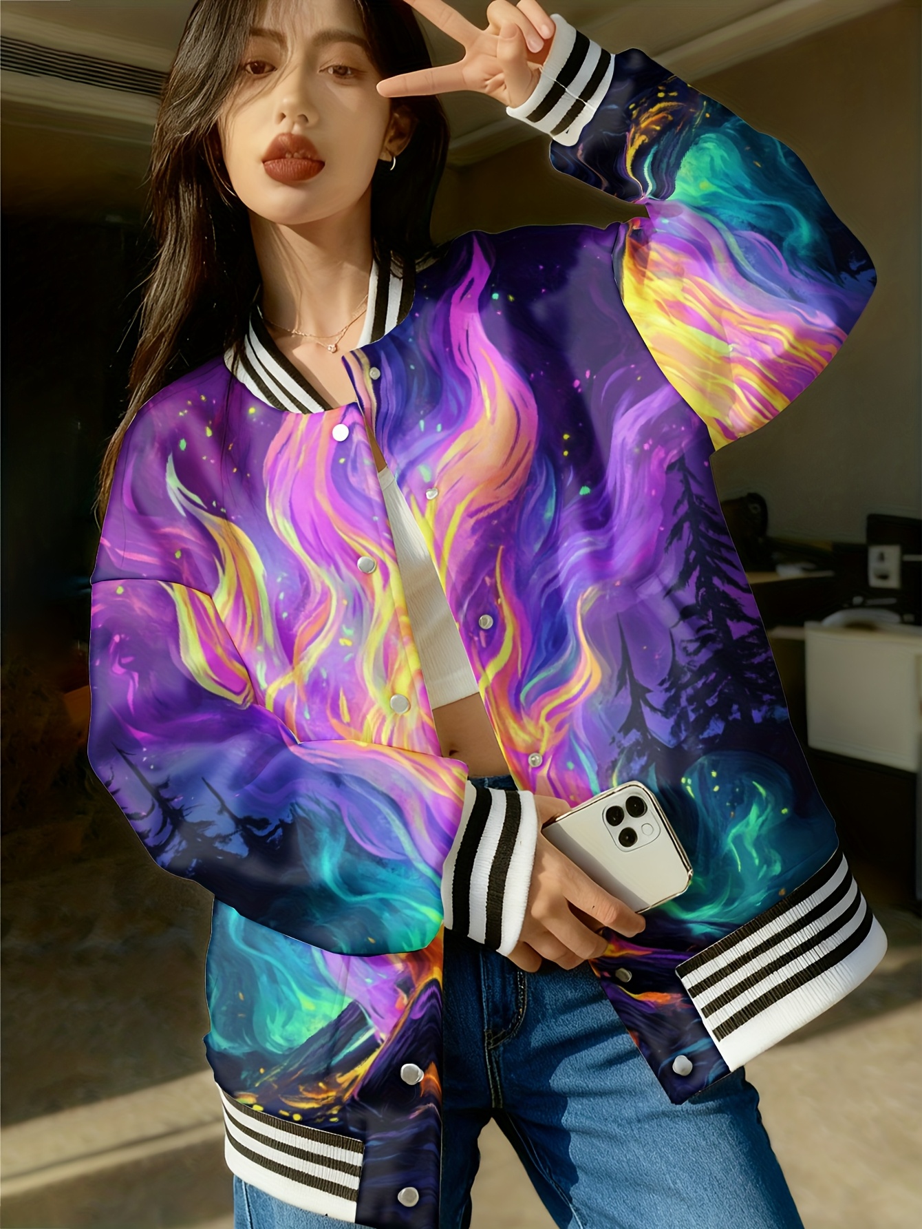 Women’S Plus Size 3D Star Print Baseball Jacket | Vibrant Multicolor (Red, Yellow, Green, Pink, Orange) Oversized Casual Outerwear with Button Front Closure, Long Sleeve Winter Warmth, Star Pattern & Baseball Collar for Layering, Parties
