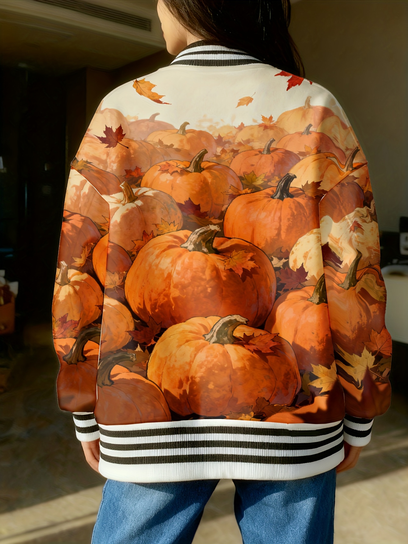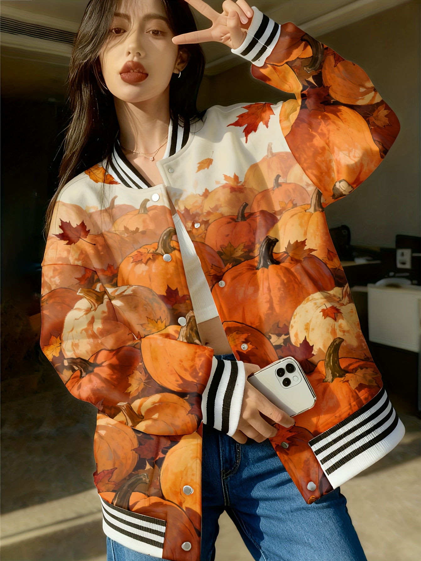 Oversized Pumpkin And Autumn Leaves Design Baseball Jacket – Complete Seasonal Pattern Coat, Stylish Casual Outerwear for Fall Winter, Cozy Long Fit with Pockets, Unisex for Everyone (No Padding