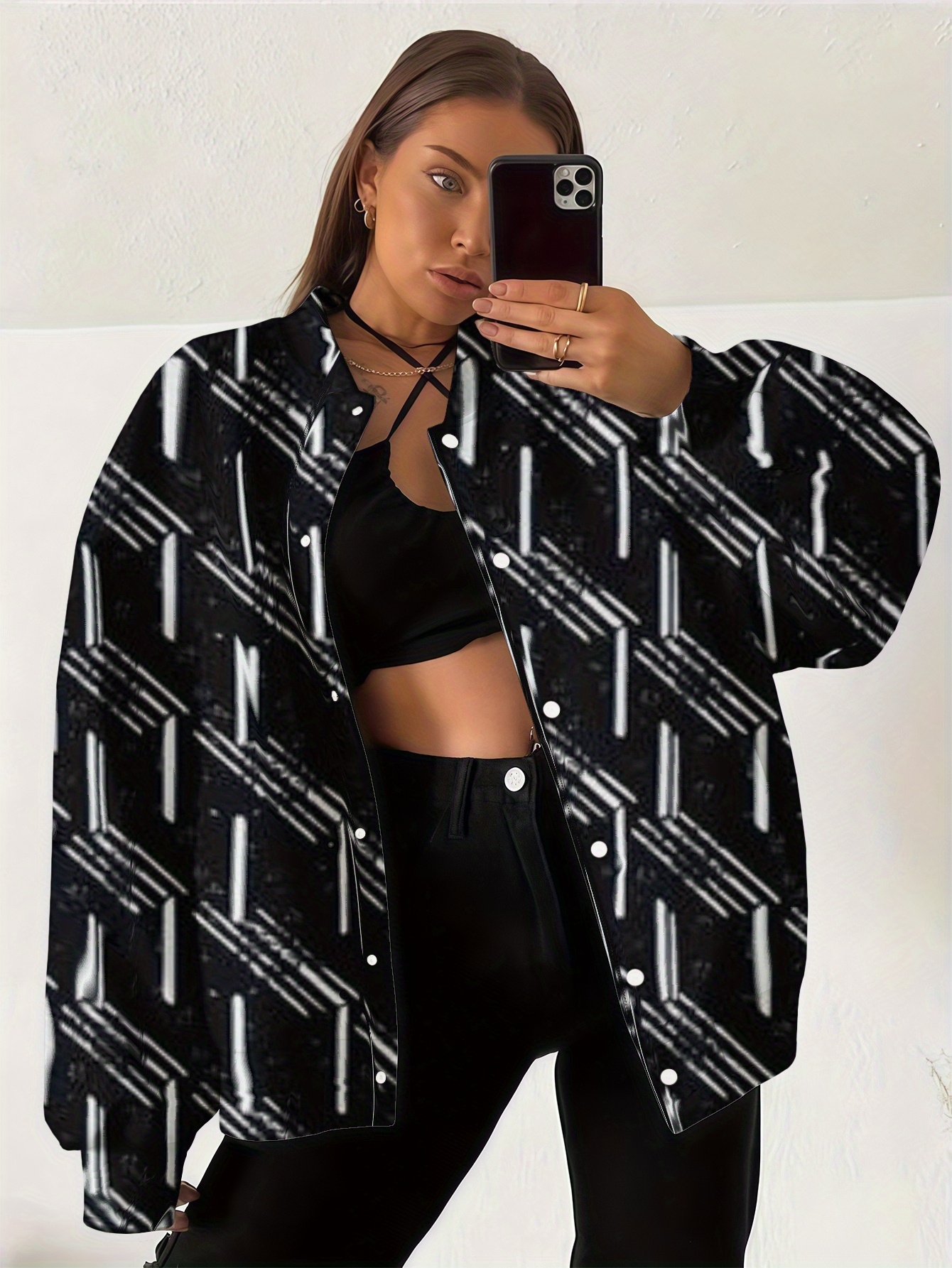 Plus Size Women’S Elegant Special Line 3D Geometric Grid Pattern Jacket | Button-Front Closure, Baseball Collar, Long Sleeve, Machine Washable, Fallu002FWinter Outerwear for Casual & Transitional Weather Wear.