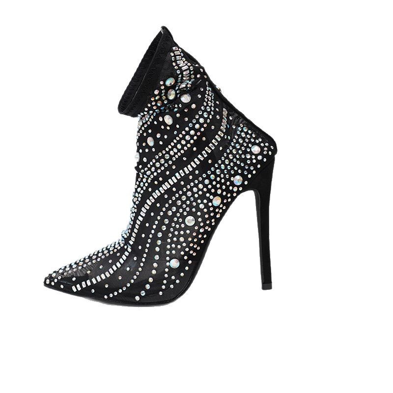 Pointed Toe High Heel Ankle Boots for Women | Strappy Mesh & Sequins Booties, Nightclub Stage Elastic Boots, Versatile & Fashionable, Ultrahigh Stiletto Heel, Slip-on Closure, All-season, EVA Upper, Mesh Inner, Insole, Rubber Sole, Women Shoes