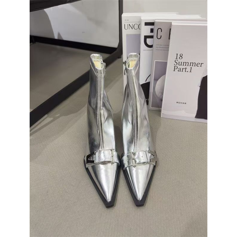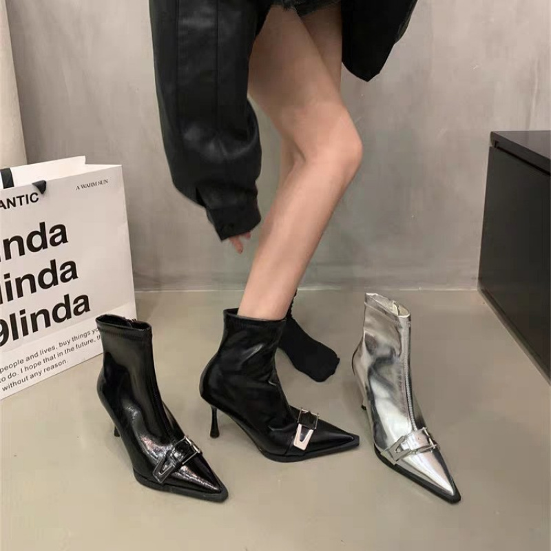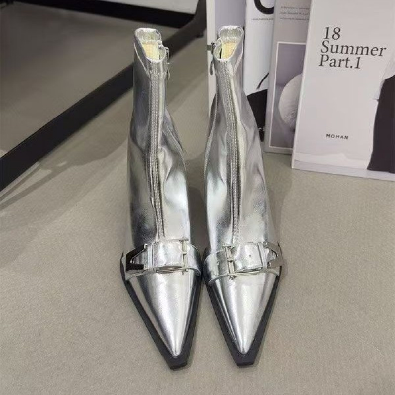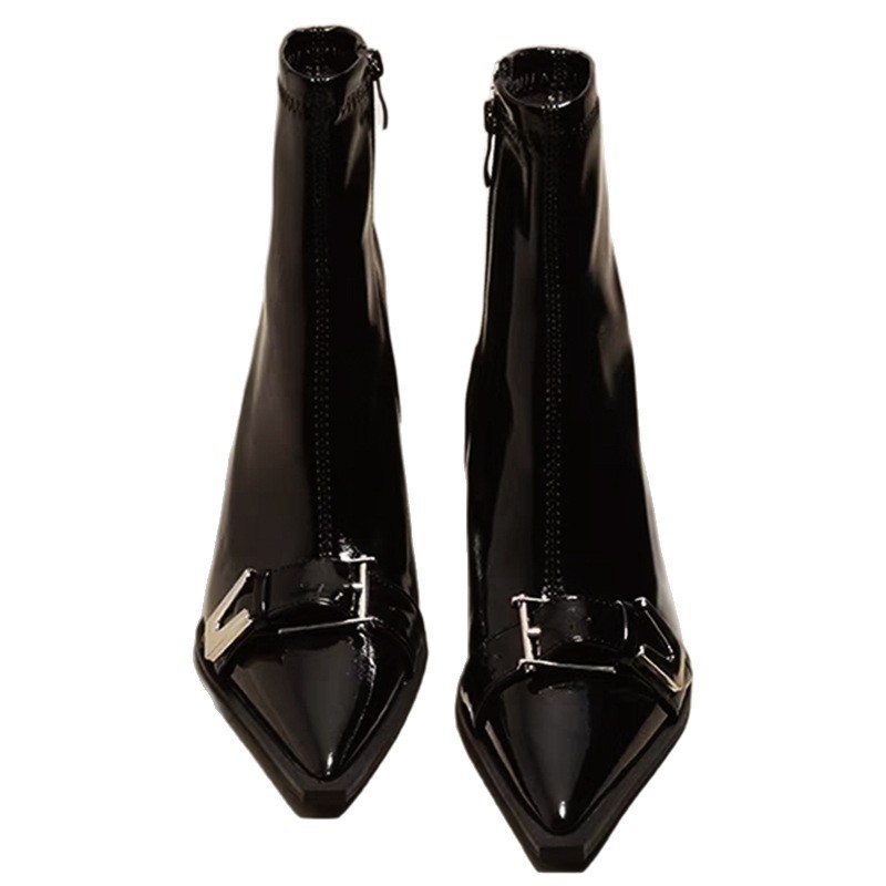 Pointed Toe High Heel Boots Women | 2026 Autumn Winter New Trendy Cool Metal Professional Boots, Thin Mid Heel, Zipper Closure, Fabric Upper and Sole, Women Shoes