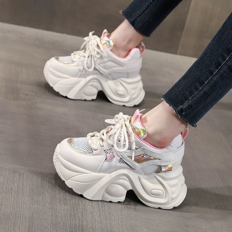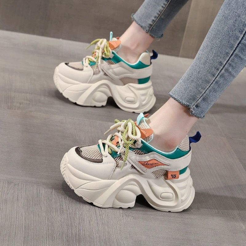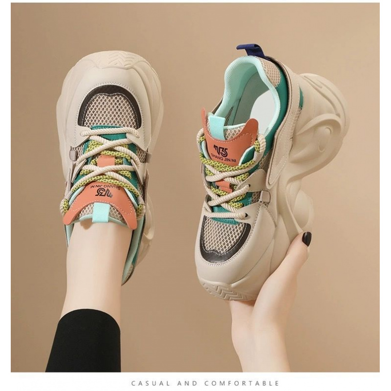 Women’s Chunky Sneakers Mid-Top Lace-Up – Beigeu002FTealu002FOrange & Whiteu002FPink Color Options, Mesh Upper & Rubber Sole, All-Day Casual Shoes for Gym, Outfits, Year-Round Wear – Trendy Chunky Platform Footwear