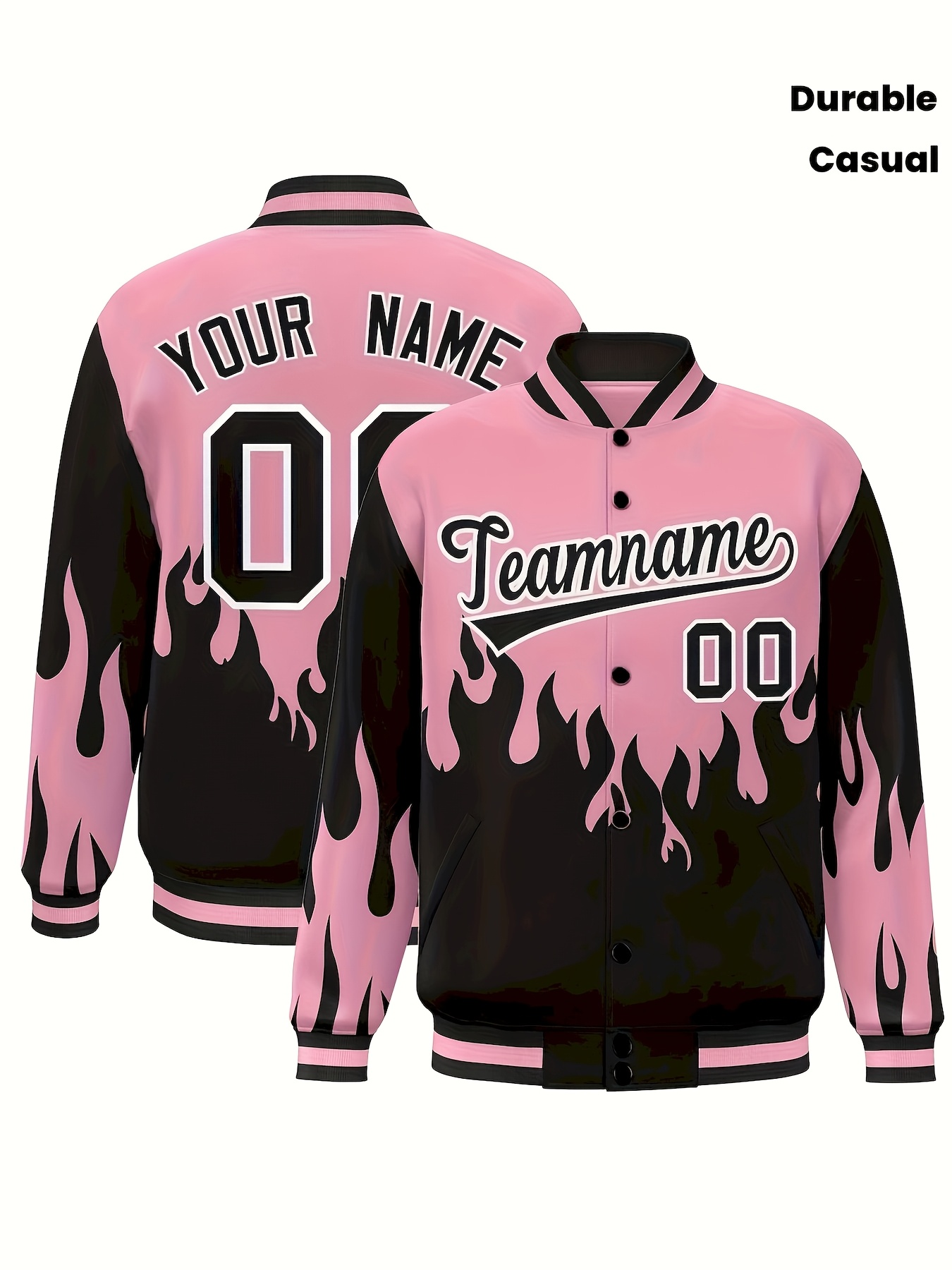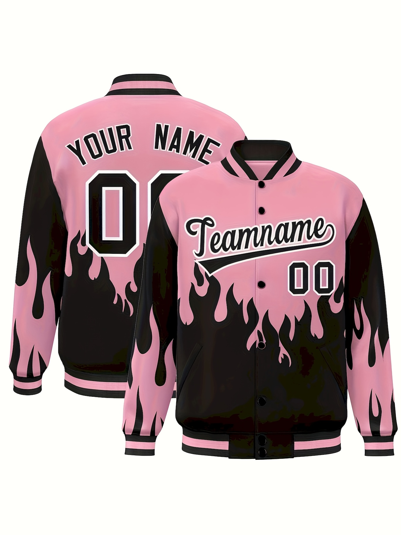 Women’S Long Sleeve Baseball Jacket | Pink and Black Flame Design with Buttons, Crew Neck, Regular Sleeve, Slight Stretch Fabric | Ideal for Sports Fans and Fashion Enthusiasts, Perfect for Casual Wear and Festive Seasonal Gifts