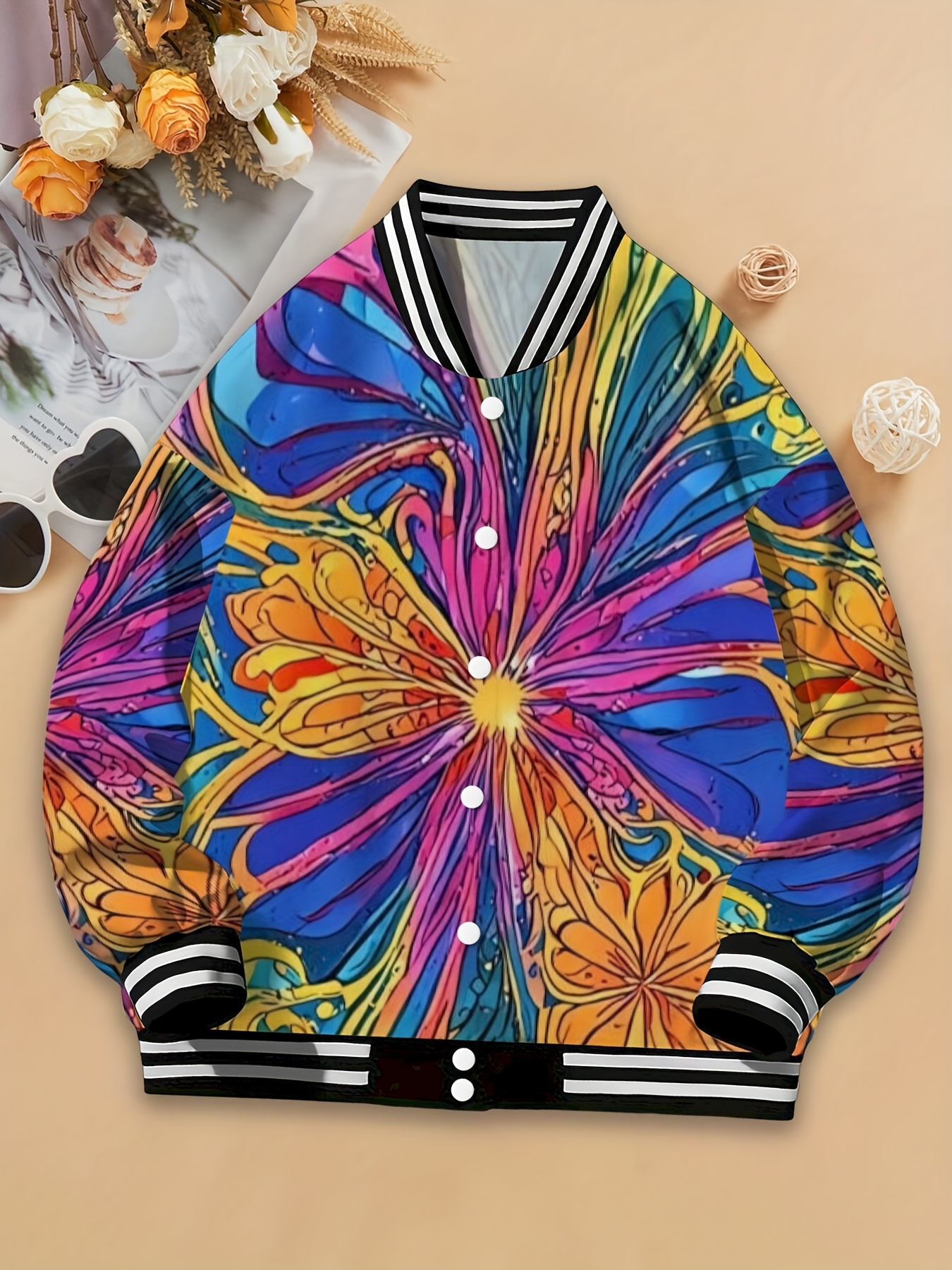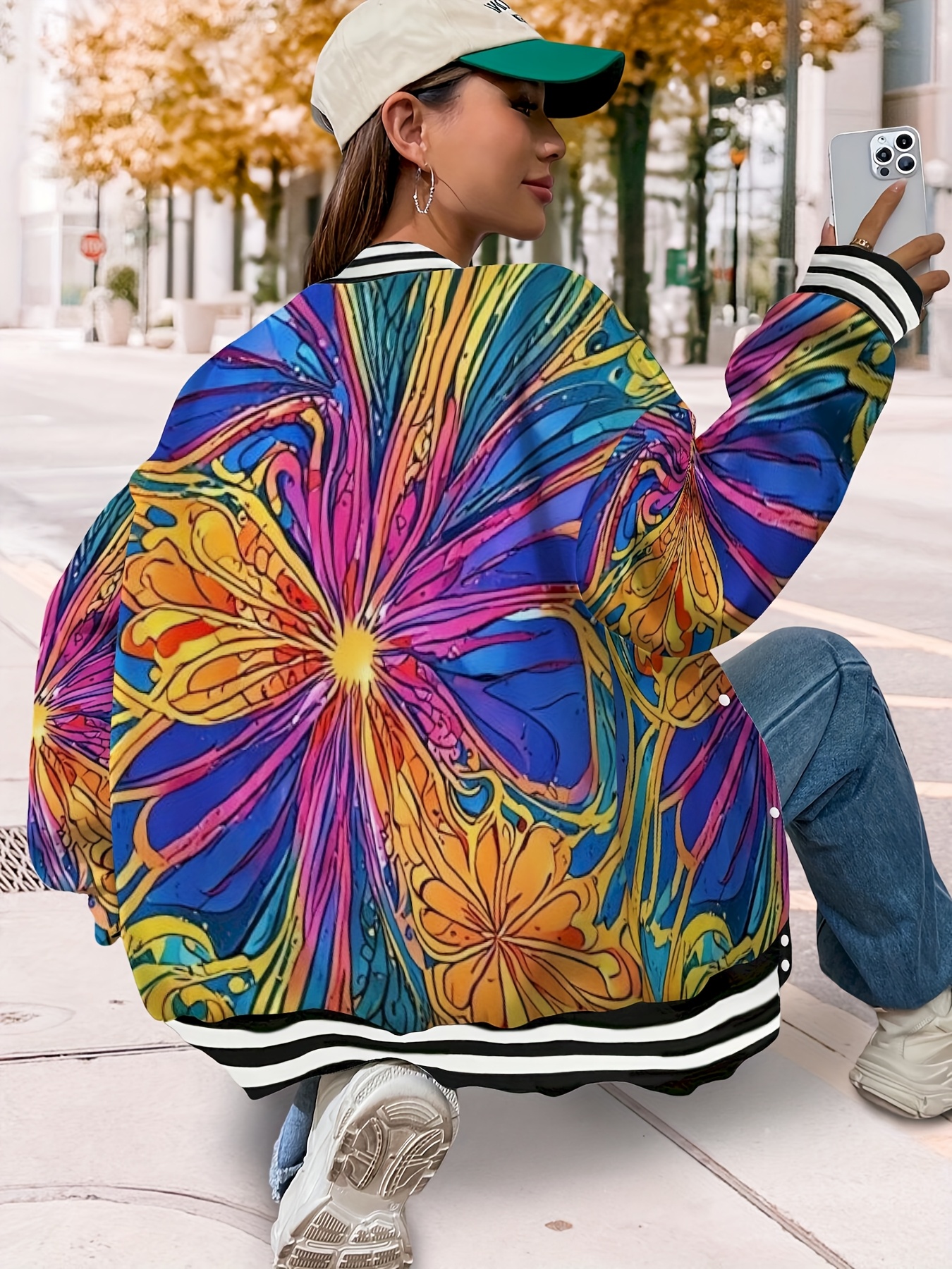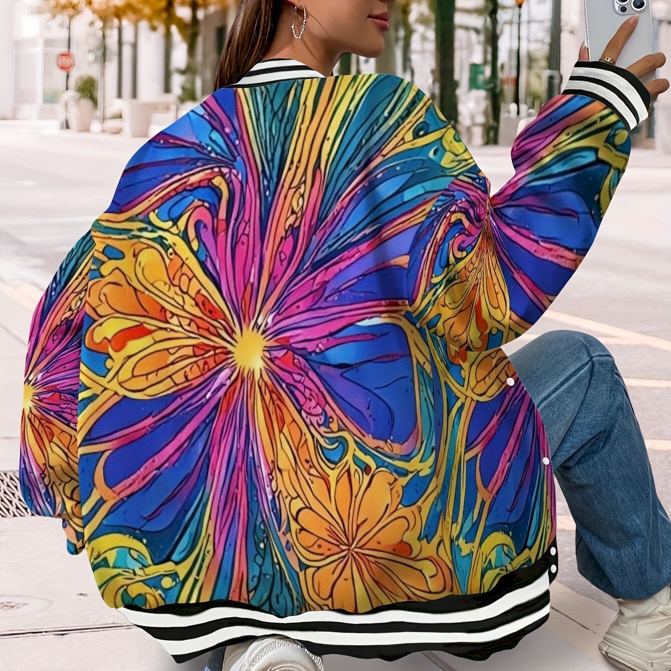 Women’S Long Sleeve Baseball Jacket with Buttons | Colorful Psychedelic Flower Print, Vibrant Artistic Design Inspired by Summer Festivals and Music Events, Perfect for Casual Outings, Streetwear | Spring Season, Crew Neck, Regular Sleeve