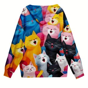 Women’S 3D Printed Cat Face Hooded Cardigan Jacket – Lightweight Cozy Sweater with Expressive Smiling, Surprised & Angry Cat Patterns, Long Sleeve Winter Warmth, Casual Outerwear for Cat Lovers (Autumnu002FWinter) – Playful Cat-Themed Sweater with Rando