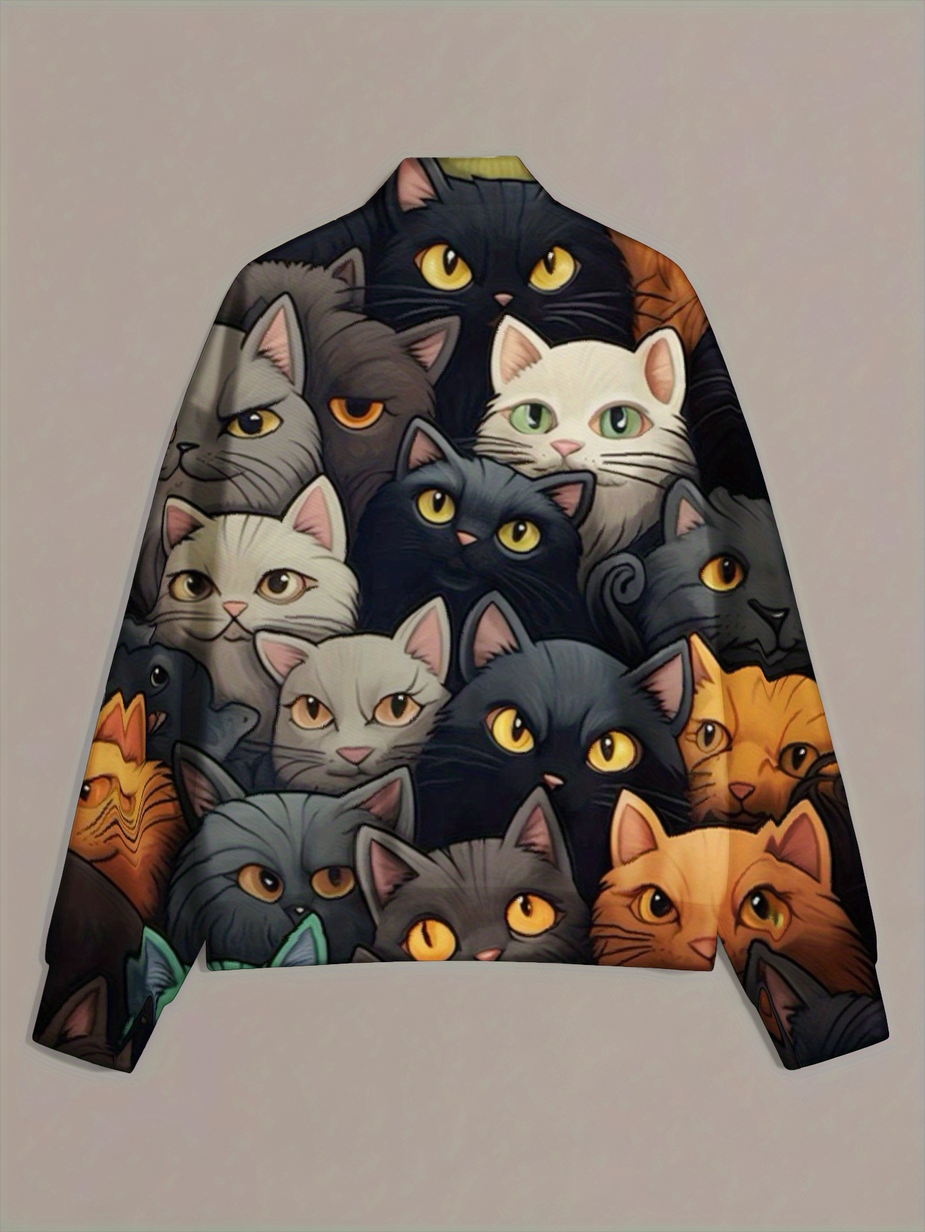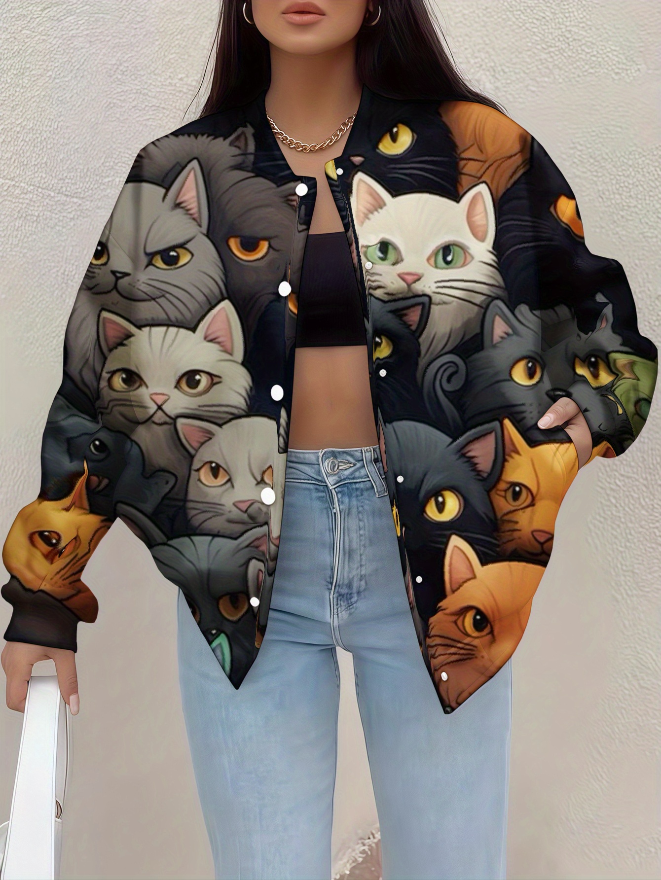 Women’s Plus Size 3D Cat Face Print Baseball Jacket- Cute Tabby Cat Design with Expressive Eyes, Machine Washable, Long Sleeve Casual& Formal Outerwear