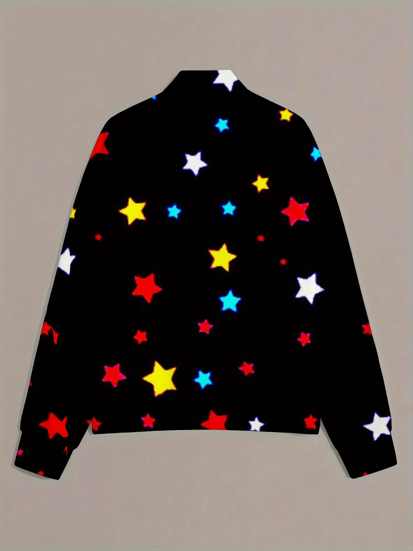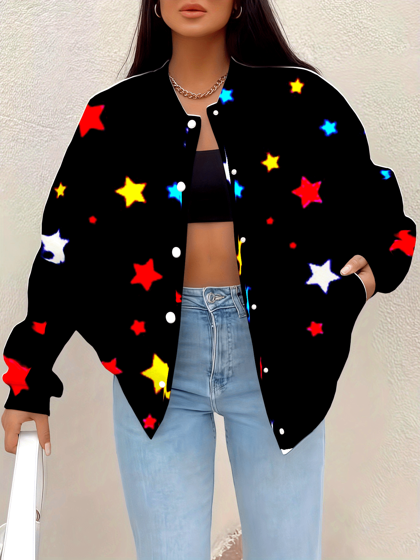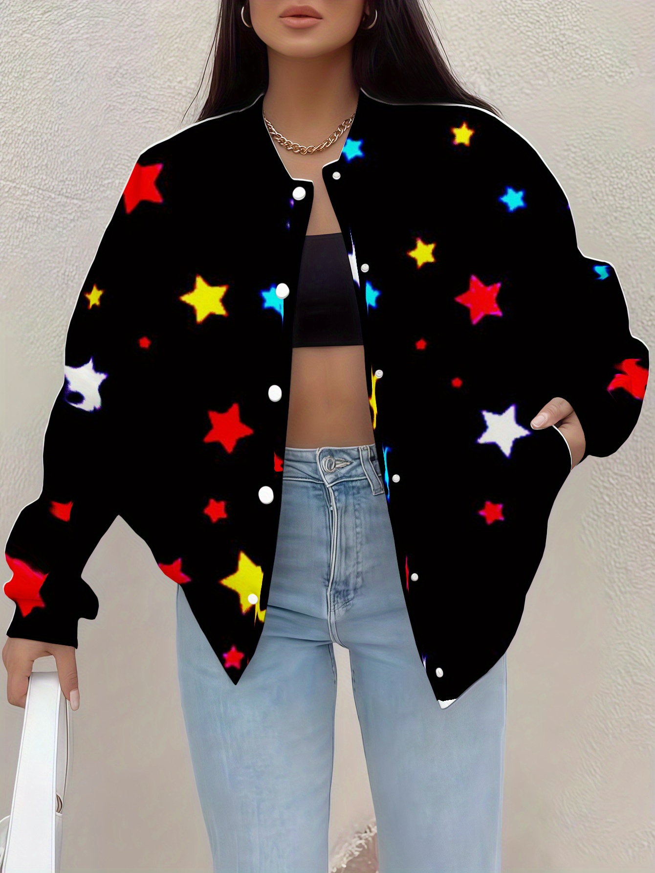 Women’S Plus Size 3D Star Print Baseball Jacket | Vibrant Multicolor (Red, Yellow, Green, Pink, Orange) Oversized Casual Outerwear with Button Front Closure, Long Sleeve Winter Warmth, Star Pattern & Baseball Collar for Layering, Parties