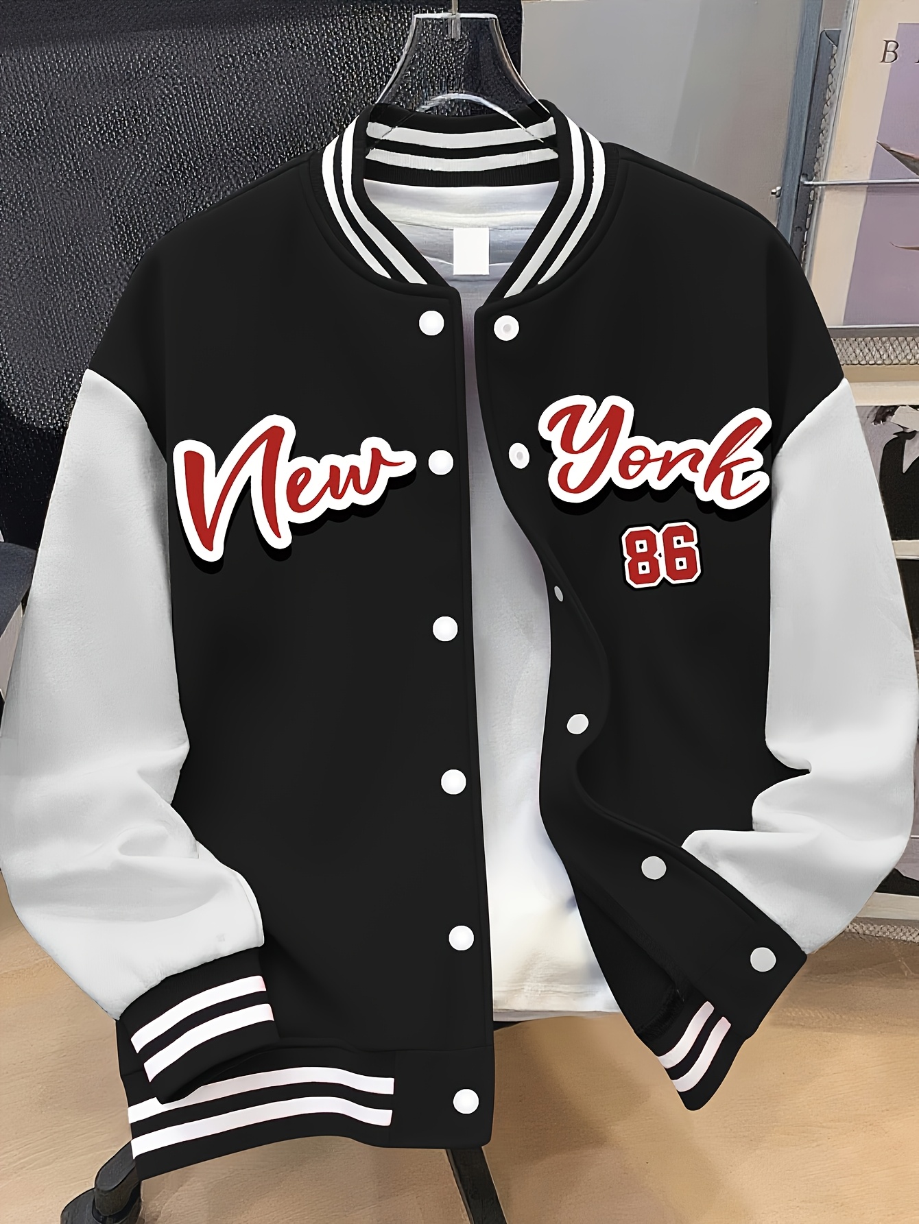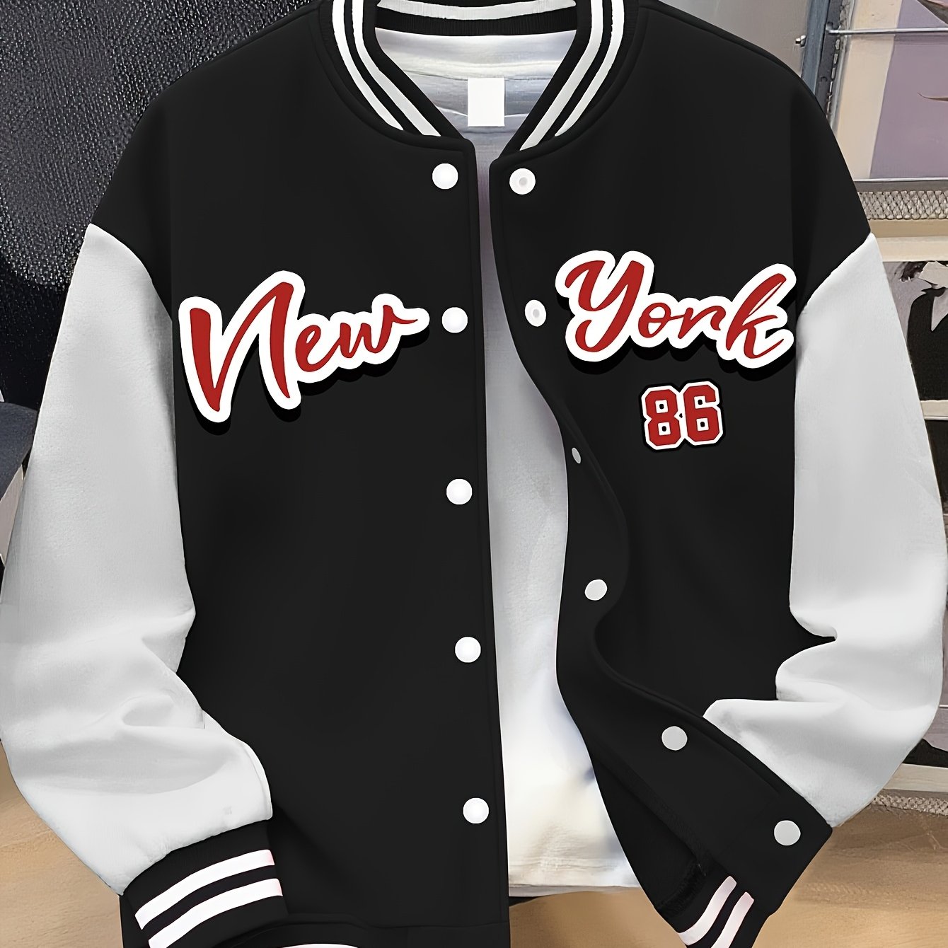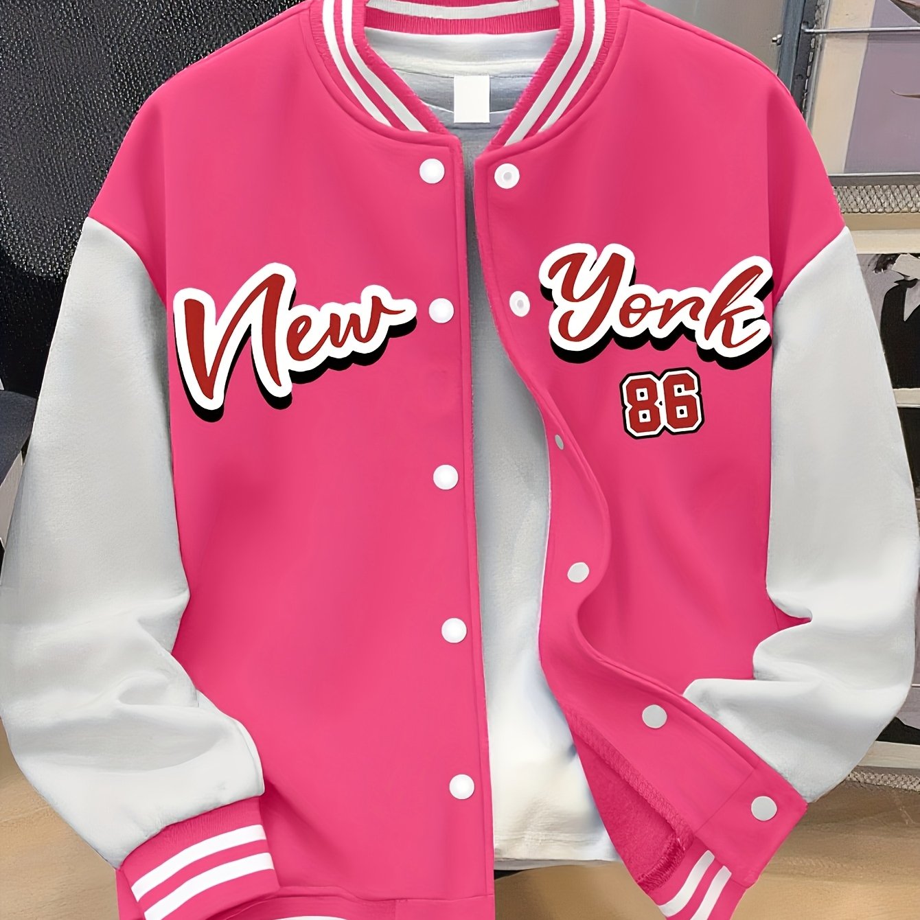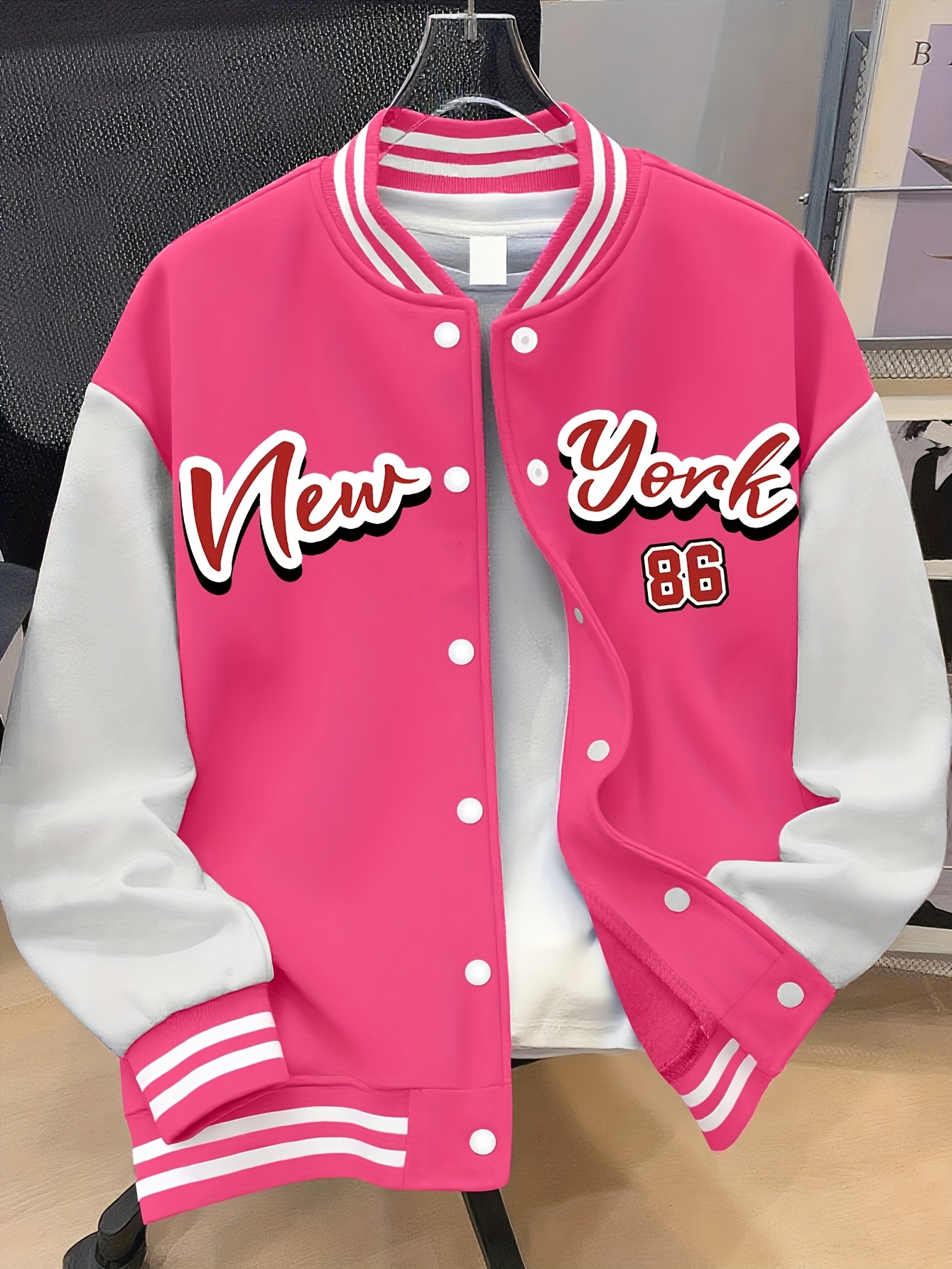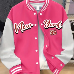 Women’s Plus Size Baseball Jacket Pink & White Color Block Coat with NEW YORK Brooklyn Lettering, Baseball Collar, Machine Washable, Casual Winter Wear, Durable Fabric Coat_6