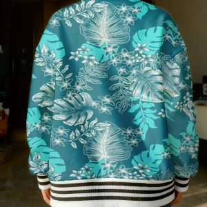 A Turquoise Baseball Jacket Designed for Plus-Size Women, Showcasing a Tropical Leaves And Hibiscus Design, Complete with a Floral Motif, Long Sleeves, And Pockets. This Fashionable Outerwear Is Ideal for Casual Wear
