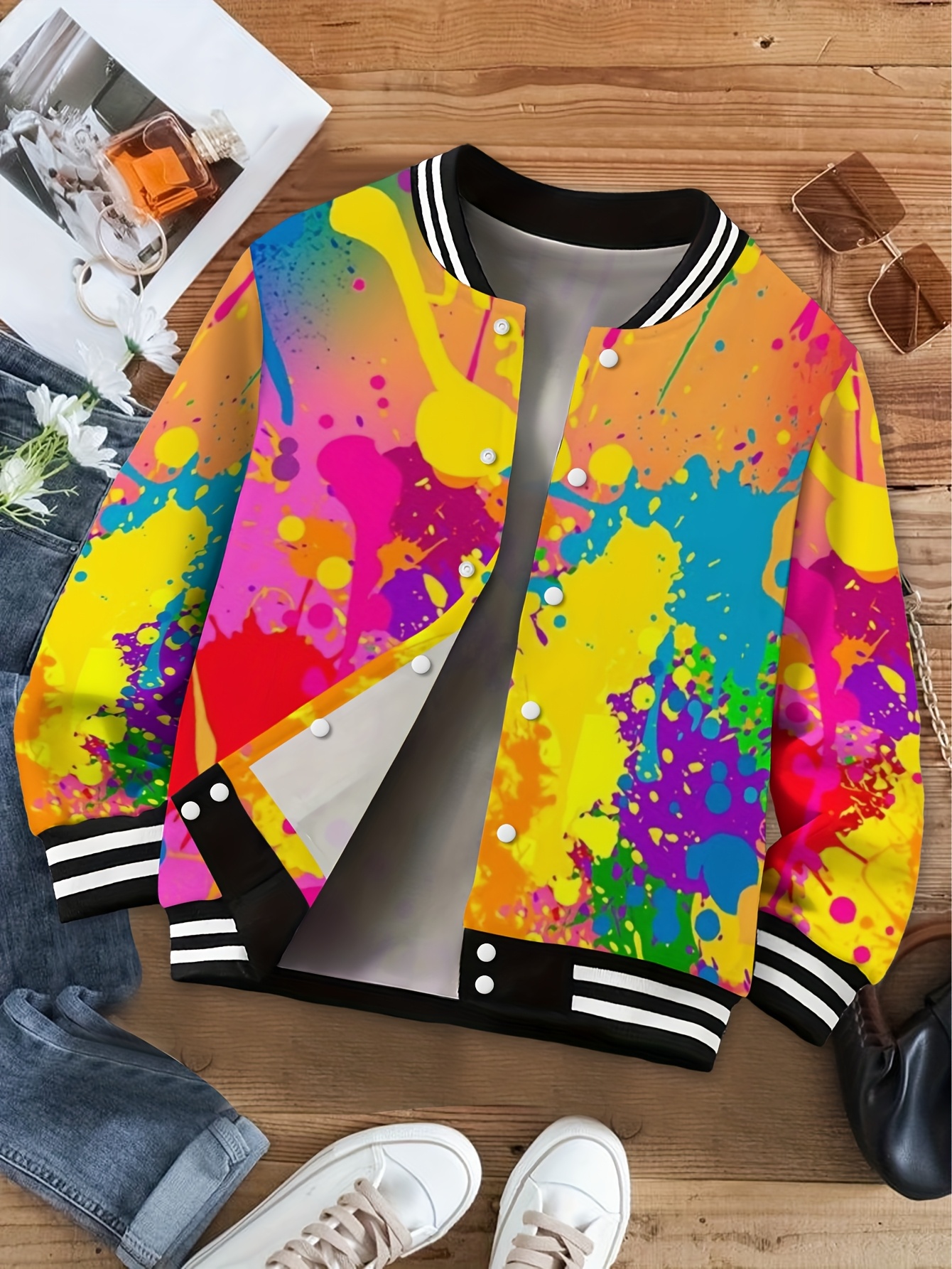 Be the first to review “Women’s Printed Baseball Collar Jacket, Autumn and Winter Casual Sports Style Bright Color Printed Coat, Machine Washable Abstract Pattern Loose Street Style Bomber Jacket, Fun Baseball Style Women’s Jacket” Cancel reply