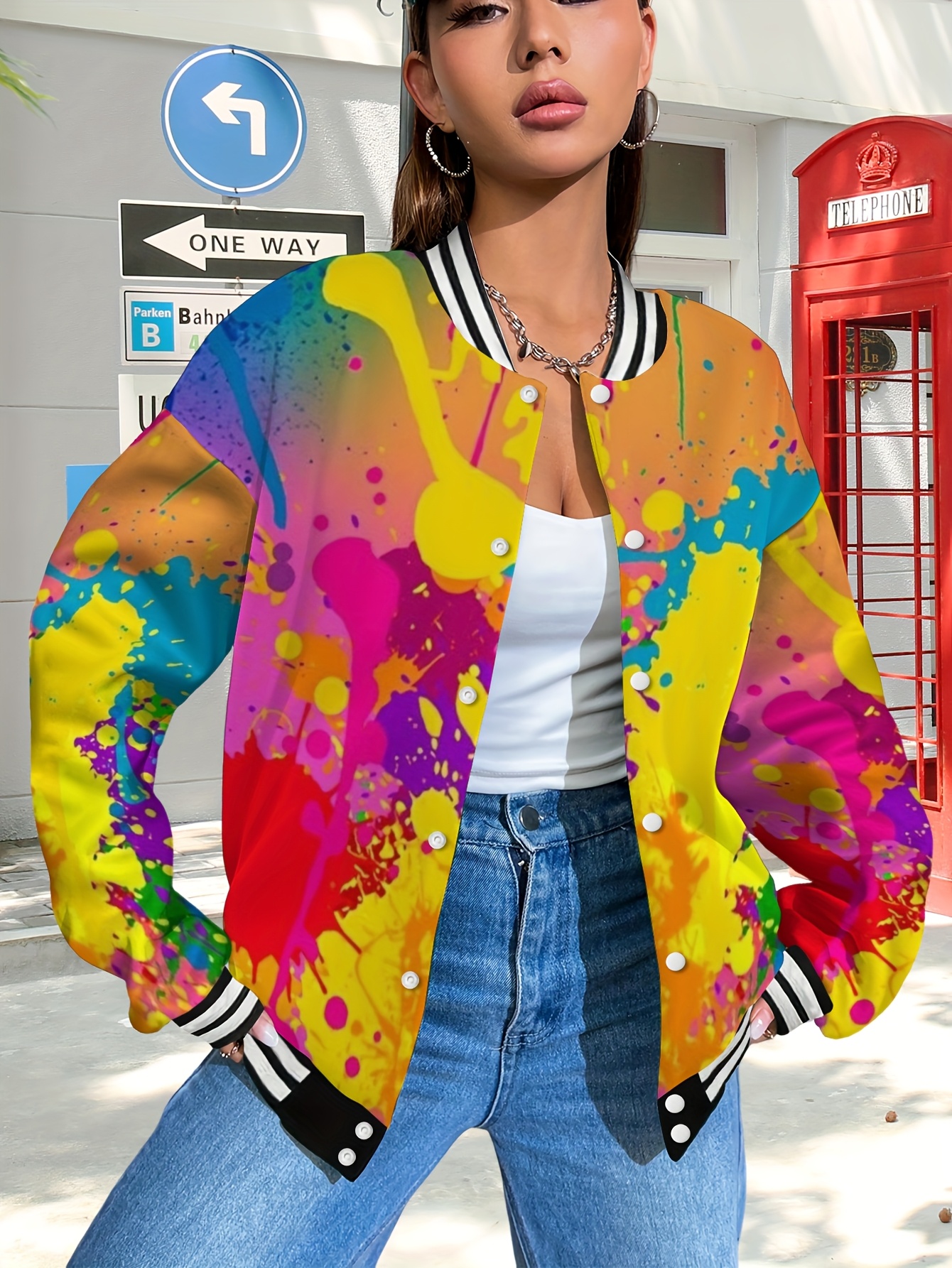 - Women’s Printed Baseball Collar Jacket, Autumn and Winter Casual Sports Style Bright Color Printed Coat, Machine Washable Abstract Pattern Loose Street Style Bomber Jacket, Fun Baseball Style Women’s Jacket