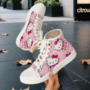 Women’s Sanrio Hello Kitty Thigh-High Sneakers – Official Licensed Lace-Up Boots with Hello Kitty Face & Bow Design, Soft TPR Sole & Breathable Fabric Upper, Round Toe Suitable for Casual,,, Casual Attire, Pink & Black, Women Shoes